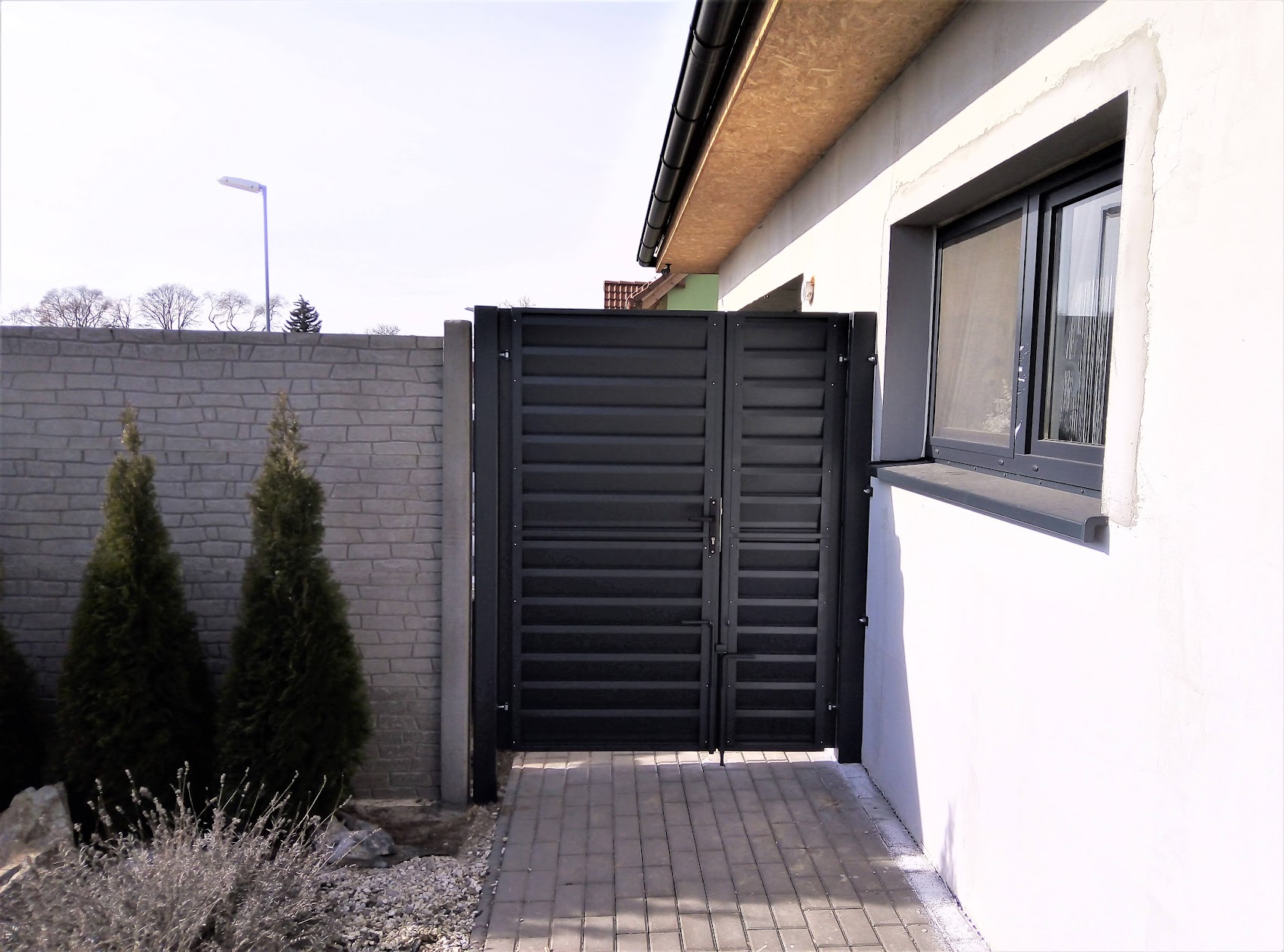 | ← HUP-Tür, pulverbeschichtet | zweiflügeliges Tor, Konstruktion aus Feuerverzinkung, Lamellenfüllung aus Zn-Blech, Farbe Anthrazit → |