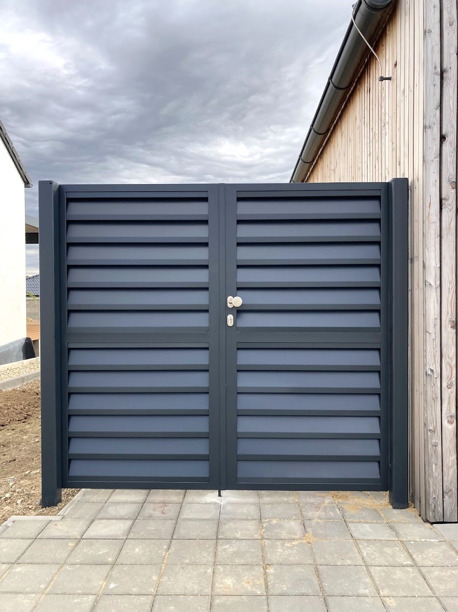 | ← verzinktes Schiebetor auf Gitterschiene | Einflügeliges verzinktes Tor, Aluminiumlamellen und anthrazitfarbene Füllung → |