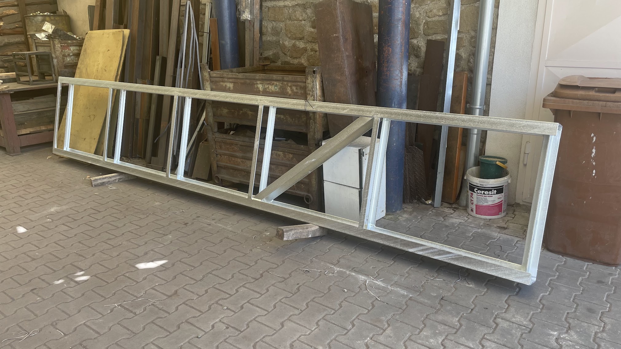 | Konstruktion der Erweiterung, farbige Stahlprofile, „Metsec“-Profile aus Zn-Blech, Blechboden und Handlauf aus heißem Zink M |